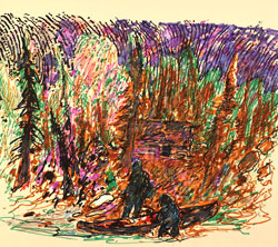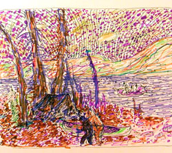 Campement - Barque et personnages dans lac 46 x 61 cm (18 x 24 pouces) Dessin crayons feutres couleurs |