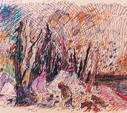 | Campement au bord de l'eau 46 x 61 cm (18 x 24 pouces) Dessin crayons feutres couleurs |