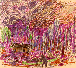| Cabane près de la rive 46 x 61 cm (18 x 24 pouces) Dessin crayons feutres couleurs |