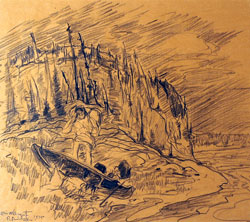 Trappeur et canot (ca 1945) 42 x 50.8 cm (16.5 x 20 pouces) Dessin sur papier Kraft |